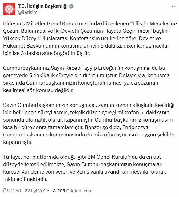 “Sayın Cumhurbaşkanımızın konuşması, zaman zaman alkışlarla kesildiği için belirlenen süreyi aşmış; teknik düzen gereği mikrofon 5. dakikanın sonunda otomatik olarak kapanmıştır. Cumhurbaşkanımız konuşmasını kısa bir süre sonra tamamlamıştır. Benzer şekilde, Endonezya Cumhurbaşkanının konuşmasında da mikrofon aynı usule uygun şekilde kapanmıştır.